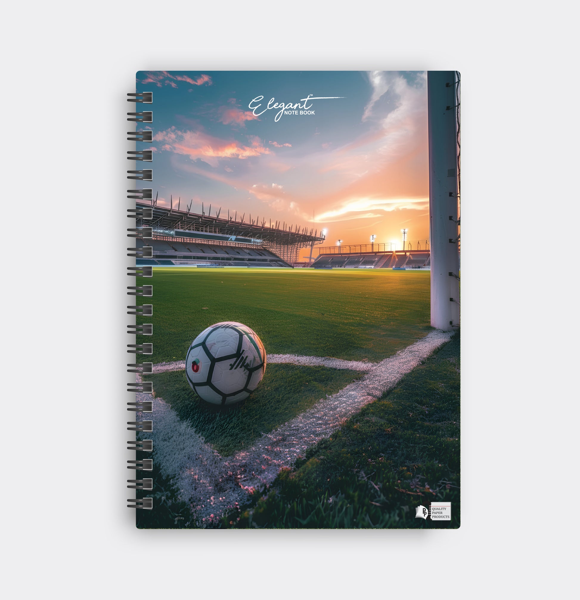 Elegant Soccer Field A4 Spiral Notebook is crafted with high-quality imported paper for a smooth writing experience. Featuring single-lined pages with a date section and durable spiral binding, it displays a beautiful evening scene of a soccer ball on the pitch. Exclusively for soccer lovers.